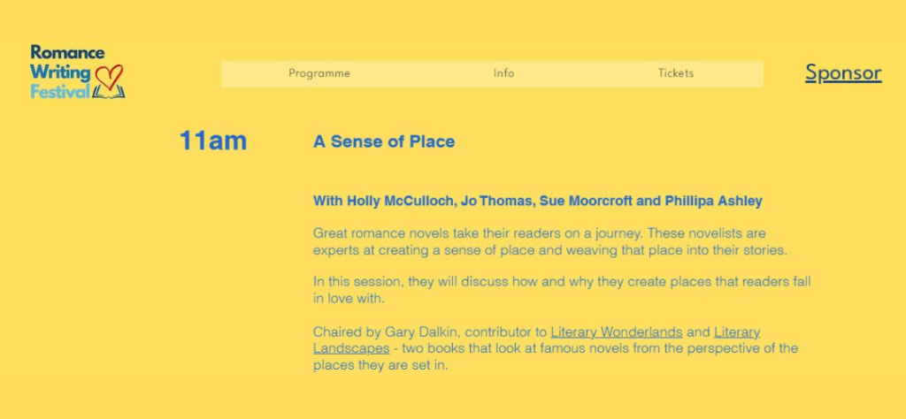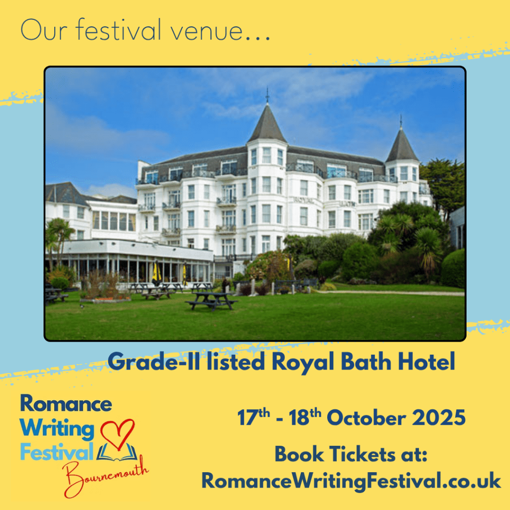 Now imagine it is Monday 9 June 2025. I turn on my phone and am astonished to see a message from the director of the Bournemouth Writing Festival, Dominic Wong, asking if I’d like to chair a panel at the Romance Writing Festival in October exploring the idea of ‘A Sense of Place’. The panel is to feature the bestselling novelists Phillipa Ashley, Holly McCulloch, Jo Thomas, and President of the Romantic Novelists’ Association, Sue Moorcroft.
