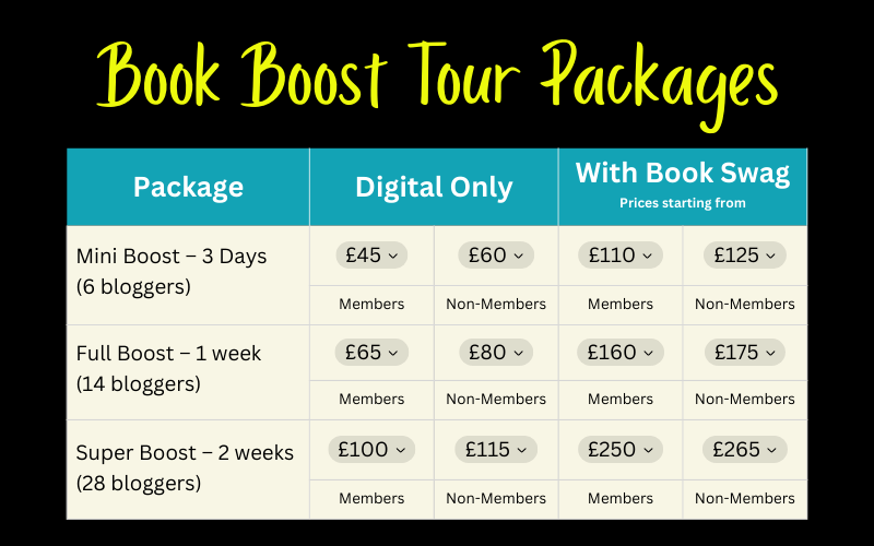 💻+🎁 Digital + Book Swag – We design, print, and ship (UK only) merchandise with your branding (eg bookmarks and pens) to bloggers (overseas shipping would incur additional charges). Prices will depend on merchandise requested.